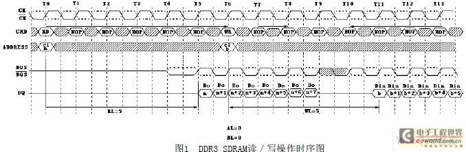 在读写操作方面,与DDR2一样,读操作时由内存给出一个与数据同步的DQS信号,它的边沿 与读数据一致;写操作时,控制器同样给出一个与数据同步的数据滤波信号DQS,它的边沿处于写数据当中.DDR3具有on-the-fly突发模式,允许用户在此模式下选择4或8的突发长度。图1 给出了DDR3内存典型的读/写操作时序图[2]。