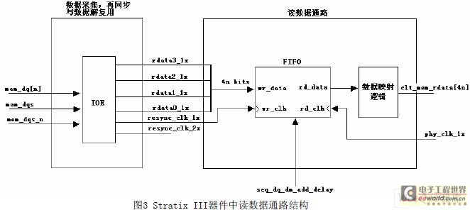 时钟与复位管理模块主要负责时钟信号的产生与移相,以及时钟网络类型的控制;地址与 指令通路负责接收控制器输出的地址和指令信号,并将其从半速率时钟转换为全速率时钟;读 数据通路是采集从存储器读出的数据,并将其再同步到系统时钟域;写数据通路将控制器输出 的半速率数据转换为双倍速率(DDR)信号,以写入DDR3器件;自校准模块用于系统上电时自动 校准DDR3器件的过程变量,以获得最大的时序余量,消除来自读数据通路的不确定因素,提高 系统高频工作下的稳定性。图3所为Stratix III器件中读数据通路的结构框图,由图中可以看 出DDR与HDR转换的过程中数据总线宽度及时钟频率的变化。