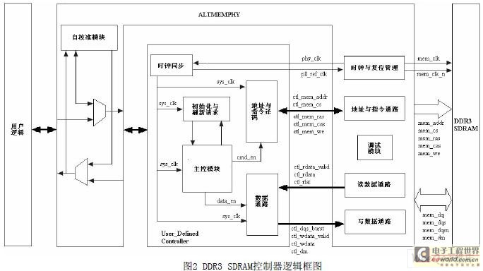 DDR3 SDRAM控制器的设计方法采用了Altera推荐的ALTMEMPHY+用户自定义控制器的结构。 与传统SDRAM控制器相比,此结构加入了ALTMEMPHY接口部分。ALTMEMPHY宏功能是Altera开发的 能够动态自校准的数据通路,允许用户在Stratix III等器件中快速建立物理层接口(physical layer interface),连接FPGA内部控制逻辑和外部存储器。使用ALTMEMPHY的的突出优点是可 以通过训练模式和校准功能来消除FPGA和存储器在制造工艺中的偏差。在工作过程中,它利用 跟踪机制来跟踪并补偿FPGA内部的电压或者温度变化,而且不会中断数据传输。DDR3 SDRAM控 制器的逻辑框图如图2所示,主要包括ALTMEMPHY和用户自定义控制器两部分。