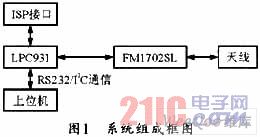 该系统主要由MCU、FM1702SL、RS232/I2C通信模块、ISP在线调试接口和天线组成。系统组成框图如图1所示。用户只需简单地通过选定的UART或IIC接口发送命令就可以对卡片进行操作,MCU根据接收到的命令来控制FM1702SL,并由FM1702SL驱动天线对MiFare卡进行读写操作。