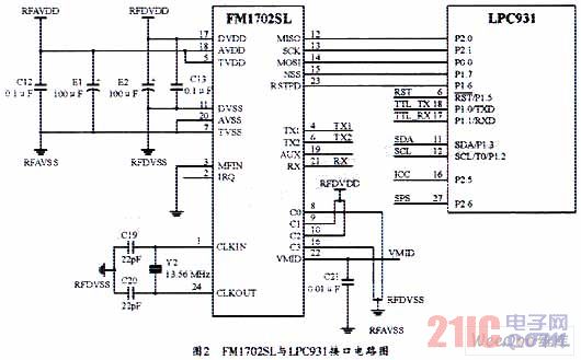 图2为FM1702SL与MCU的主要部分的接口电路。系统通过接收上位机的数据,并根据接收到的相关命令进行工作。另外。也可设定为自动寻卡方式,而无需上位机频繁发送寻卡指令,即当卡片进入到天线区后在ICC引脚上出现低电平告知上位机,上位机则通过寻卡指令直接读取卡片序列号。