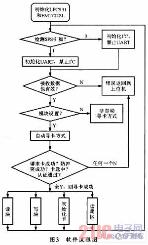 读写卡过程是一个较复杂的程序执行过程,其软件流程图如图3所示,读写卡过程需要执行一系列的操作指令,并需调用多个C51函数。如果采用自动寻卡方式,MCU需要每隔0.5秒自动寻卡一次,如果寻到卡,则ICC置1。