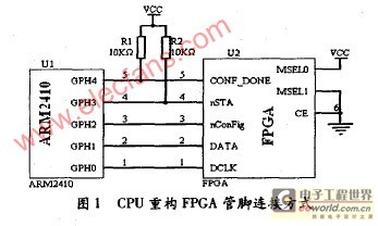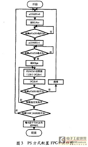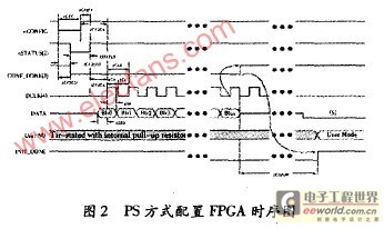 FPGA的nsTATuS管脚变高后,延时5 s左右,在DCLK的上升沿FPGA即可从DA L0管脚串行的接收配置数据,配置数据按低位在先高位在后的顺序从数据线上送出.当所有数据都接收完后释放漏级开路的CONFIG— DONE管脚,CONFIG—DONE管脚在外部需要被10 K的上拉电阻拉高,CONFIG—DONE管脚由低到高的跳变表明配置阶段结束,FPGA进入初始化阶段.如果在配置过程中出现错误,则n rATuS管脚将输出低电平,FPGA在内部自动复位,处理器可以通过查询ns1IATuS管脚状态判断在配置过程中是否有错误发生,如果nsTATuS管脚在配置过程中变低则表明有错误发生,如果在软件中设置了错误发生后自动重新开始配置选项则FPcA会延时一段时间后释放nsTATuS,此时nsTATuS被外部上拉电阻拉高,CPu在nsTA—Tus上检测到一个由低到高的跳变后重新开始配置.若软件中未设置“错误发生后自动重新开始配置”选项则需要CPu首先将nCONFIC管脚置低再拉高以开始重新配置.