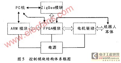 ARM模块选用s3c241Ox运行 C/OS—II实时操作系统,负责运行控制软件,完成模块化机器人运动规划,实时监控系统运行状态,实现人机交互功能及对FPGA内部逻辑实时重构.FPGA内部运行软核处理器,负责与模块化机器人运动控制相关的任务,如舵机控制、直流电机控制、系统IO控制、传感器数据采集等任务.