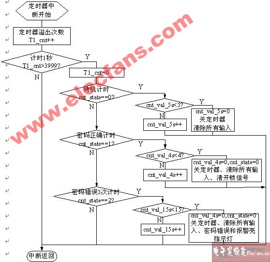 中断服务程序主要完成三种定时的计时工作,包括①按键之后启动的待机计时,当待机超过5s则清除已输入的内容。②密码输入正确之后的计时,4s之后清除开锁驱动信号与已开锁指示信号。 ③密码输入错误3次的计时,计时15s,在则15s内无法再次输入密码,15秒过后清除所有报警与指示。中断服务程序流程图如图3所示。