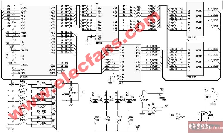 数码管驱动采用2个四联共阴极数码管显示,由于单片机驱动能力有限,采用74HC244作为数码管的驱动。在74HC244的7段码输出线上串联100欧姆电阻起限流作用。蜂鸣器的驱动采用PNP三极管8550来驱动,低电平有效。独立式按键使用上提拉电路连接,在没有键按下时,输出高电平。发光二极管串联500欧姆电阻再接到电源上,当输入为低电平时,发光二极管导通发光。