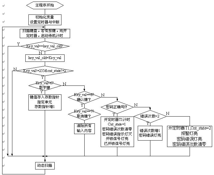 程序分为主程序和中断服务程序两个主要部分,主程序完成变量和单片机特殊功能寄存器的初始化后,进入一个循环结构。在循环中,首先判断有无按键按下,若有按键则判断是否数字键还是功能键,根据按键的情况执行相应的功能。然后根据密码是否正确的判断情况,执行相应的操作。循环中最后将需要显示的内容通过动态扫描在数码管上显示。