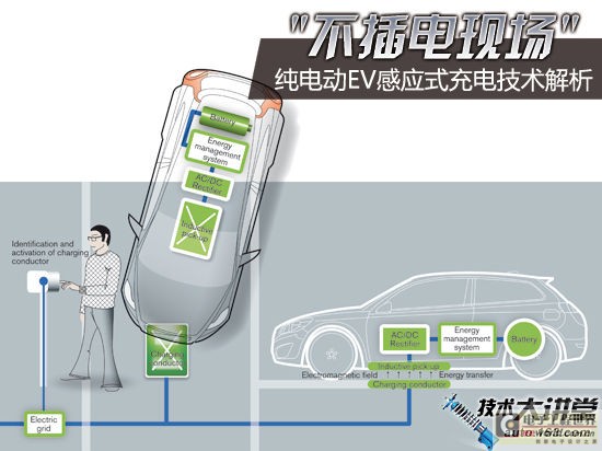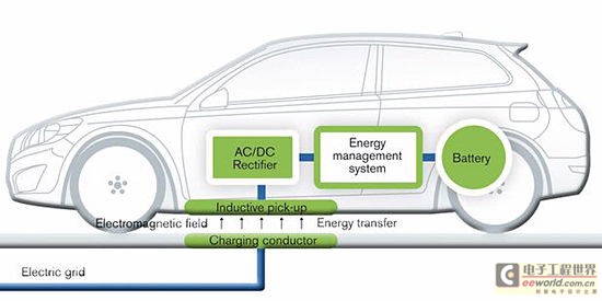 在感应式充电系统中,充电板被埋在地下,比如在自家停放汽车的车道下。充电板由可产生电磁场的线圈组成,当汽车停放在充电板上方时,电能会以交流电的形式从充电板直接传给汽车的感应接收器,然后在汽车内的电压转换器中转变为直流,给汽车的蓄电池组完成充电,它的先进之处在于整个充电过程都不需要汽车与充电板的直接接触。