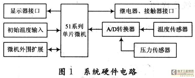 主回路交流接触器4个、空气开关2个、MCS-51系列单片微机芯片8031、各类外围接口芯片、A/D转换器、温度传感器、压力传感器、光电耦合器件、接触器驱动电路、LED显示电路等。控制系统如图1所示。