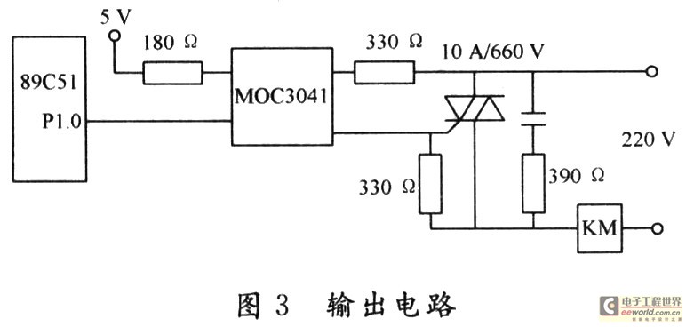 该电路用交流电磁式接触器控制设计,即由双向晶闸管驱动交流接触器KM线圈。额定工作电压为交流接触器线圈工作电压的2~3倍,额定工作电流为交流接触器线圈工作电流的1.5~2倍。此处为220 V的交流电压,选择10 A/660 V的双向晶闸管。光耦合器MOC3041R的输入端接7407,由单片机的P1.0口输出低电平,双向晶闸管导通,接触器KM吸合。反之则接触器KM释放。最后再由交流接触器的触点控制动力回路。输出信号回路如图3所示。
