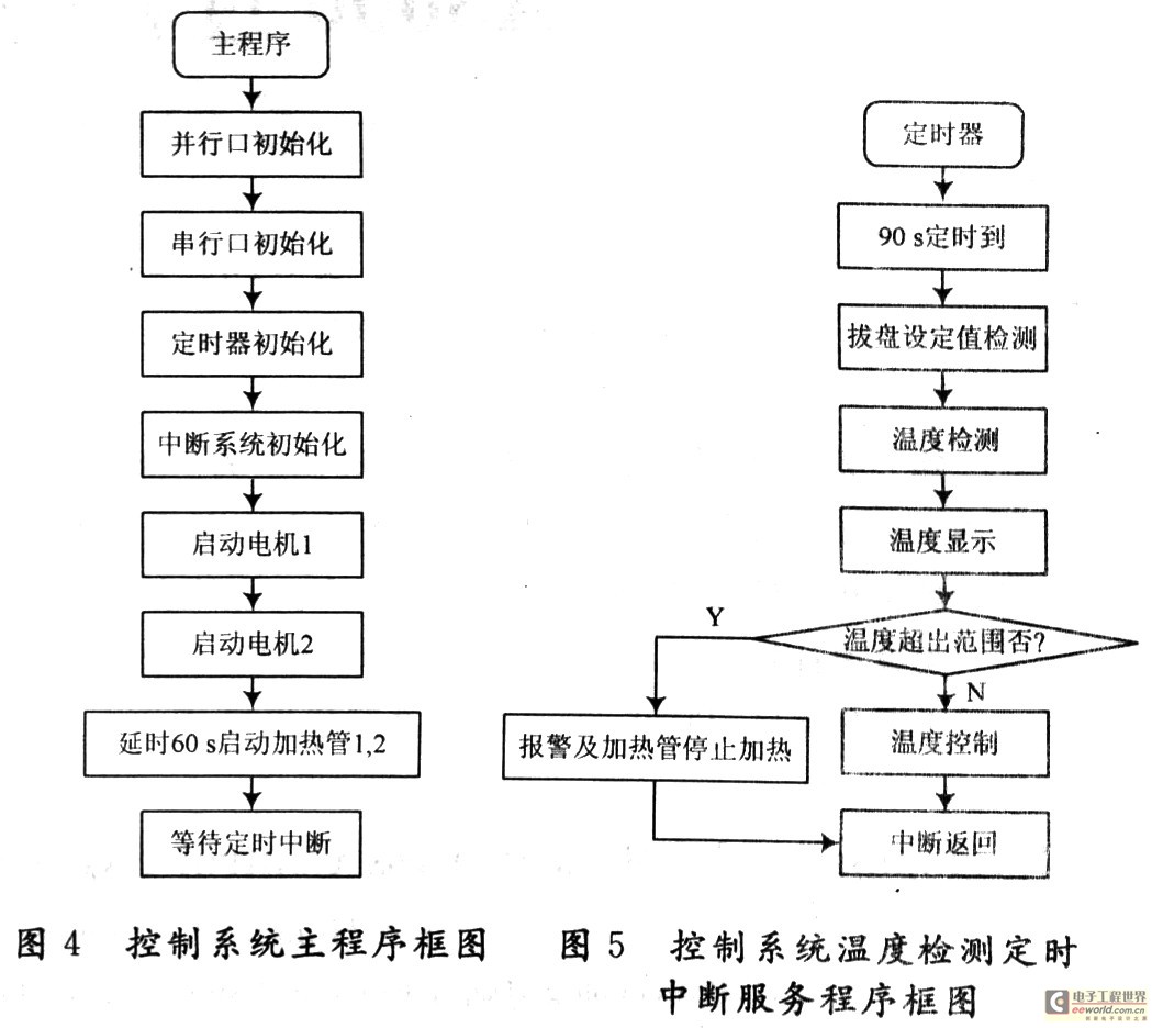 主回路采用空开和接触器实现,控制回路由单片机控制系统实现。系统启动顺序是:油泵电动机、真空泵电动机、加热管。两组加热管可分别单独加热和停机,但只有真空泵电机启动后加热管才能启动和运行。
