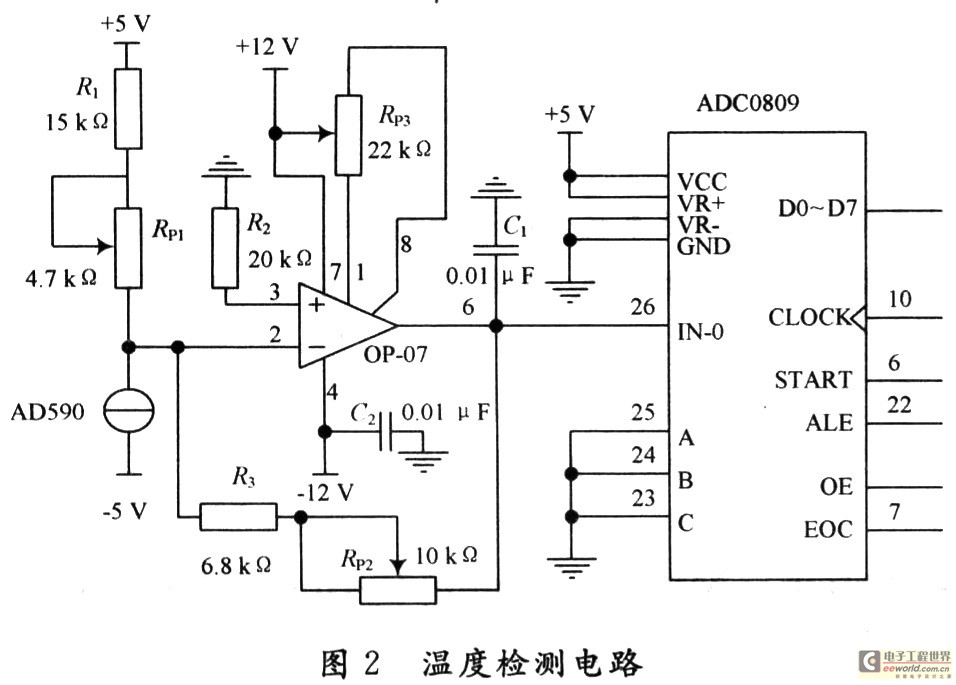 通过集成温度传感器AD590和单片机组成数字温度检测装置。AD590温度传感器属于开云棋牌官网在线客服集成温度传感器,测量范围为-55~+150℃,输出电流与温度成线性关系,它以热力学温标零点作为零输出点,比例因子为1μA/℃。因此它能把温度信号变为与绝对温度成比例的电流信号。该传感器稳定性高、线性度好。AD590本身产生的是电流信号,它将温度转换为相应的电流信号输出,在传感器输出端加运算放大器OP-07,使其输出的电流信号转换为电压信号。