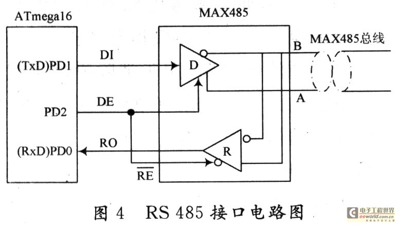 设计中选用MAXIM公司的MAX485芯片来实现RS 485接口电路。其性能特点是总线上最多可挂接32个发送器,数据率为2.5 Mb/s,具备发送和接收使能控制引脚。图4所示芯片原理图中DE是MAX485的驱动器控制端,DE=1,驱动器工作(发送);DE=0,且RE=0,接收器工作(接收)。DI为驱动器输入,RO为接收器输出,分别作为单片机UART模块的TxD和RxD。MAX485的差分信号A和B端则直接连接到RS 485总线。图4为单片机与MAX485的连接示意图。
