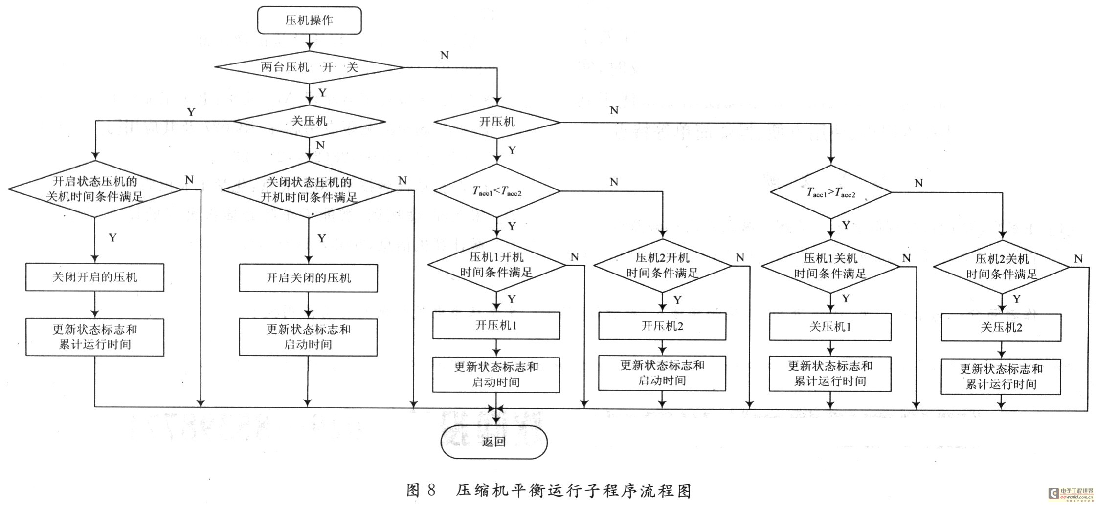 图中的Taccl和Tacc2础代表压缩机的累计运行时间。时间条件指压缩机停机时间必须超过3 min才能再次启动,压缩机启动后的运行时间必须超过90 s才能关闭,压缩机的状态标志指开启或者关闭状态,在关闭压缩机时才记录累计运行时间。