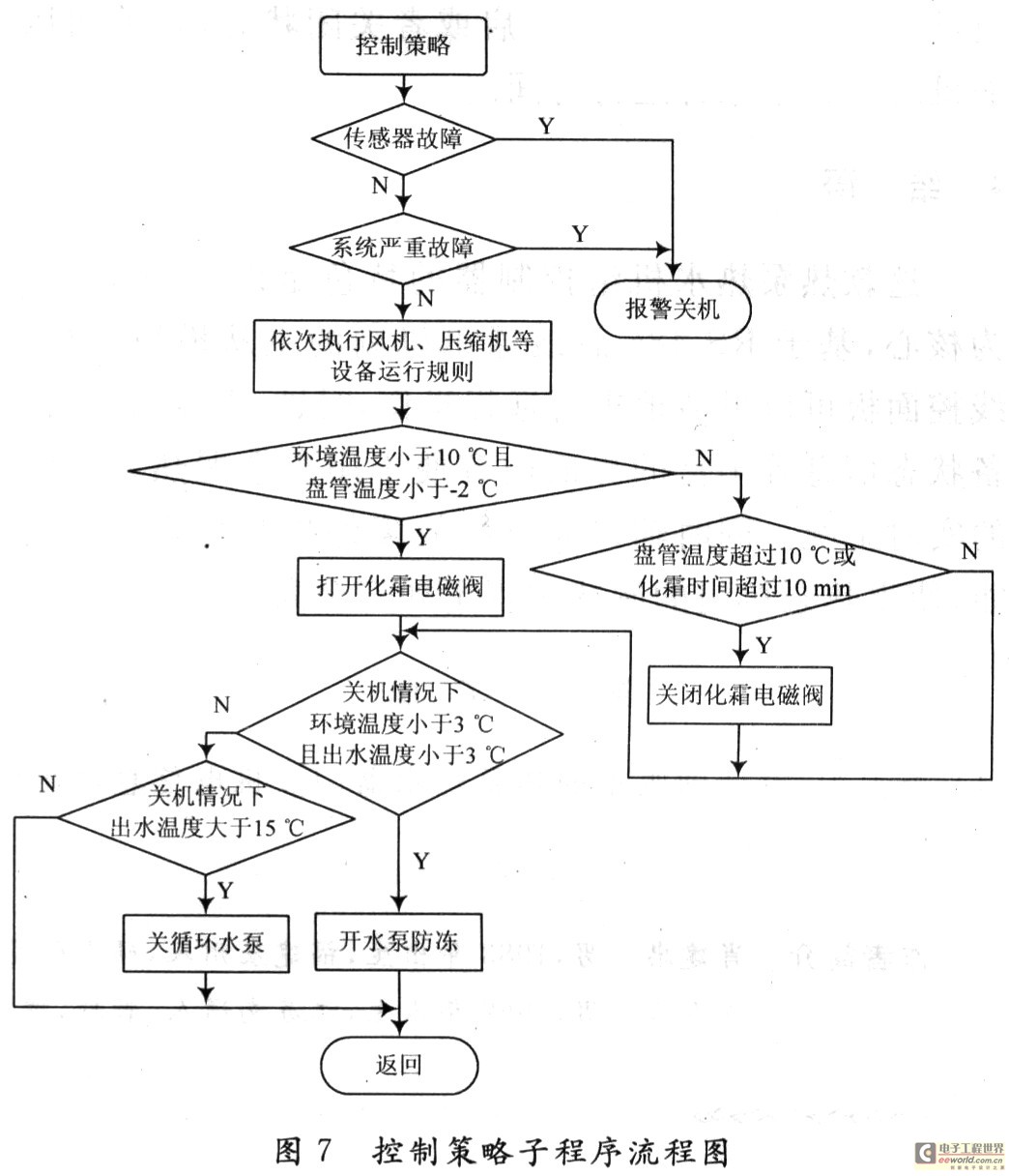 控制策略子程序首先检测温度传感器和压力传感器是否有短路或者断路故障,有则显示故障代码,系统关机。接着执行系统严重故障保护(压缩机高压或低压保护、水流开关保护等)。然后依次执行风机、压缩机、电加热、注液阀、补水电磁阀等设备的运行规则,最后执行盘管化霜和冬季防冻的特殊功能,其流程如图7所示。