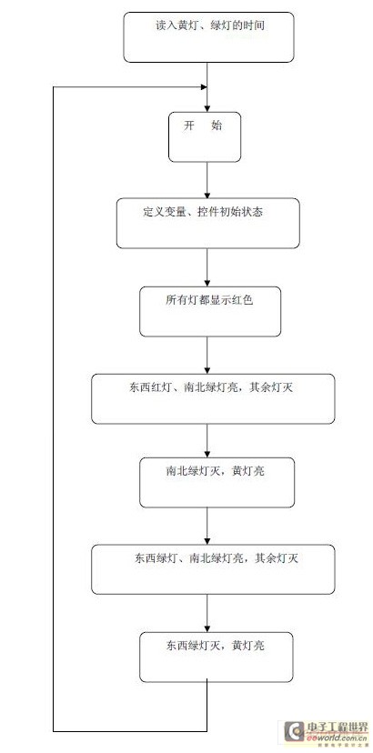 本系统的设计首先必须了解交通路灯的亮灭规律。设有一个十字路口,1、3 为南,北方向, 2、4 为东,西方向,初始态为4 个路口的红灯全亮。之后, 1、3 路口的绿灯亮,2、4 路口的红灯亮, 1、3 路口方向通车。延迟一段时间后, 1、3 路口的绿灯熄灭,而1、3 路口的黄灯开始闪烁。闪烁若干次后, 1、3 路口的红灯亮, 同时 2、4 路口的绿灯亮, 2、4 路口方向开始通车。延迟一段时间后, 2、4 路口的绿灯熄灭,而黄灯开始闪烁。闪烁若干次后,再切换到1、3 路口方向。之后,重复上述过程。对于各组灯的亮灭,我们运用的是8255A 的输入输出功能。