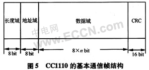 下面以节点间点对点通信为例,介绍无线传感器节点间通信实现方法及通信过程。CC1110的MAC帧结构简单,剔除物理层的前导码和同步字,只包含一个可选的长度字节n、一个可选的地址字节,用户数据和两个可选的CRC字节,如图5所示。