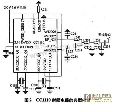 CC1110芯片只要极少数外围元件就能够搭建稳定可靠且功耗低的SoC,大大简化了RF电路的设计过程。设计的传感器节点工作在433 MHz频段。图2是CC1110的参考设计,主要由CC1110芯片、射频匹配电路和其他外围元件组成。
