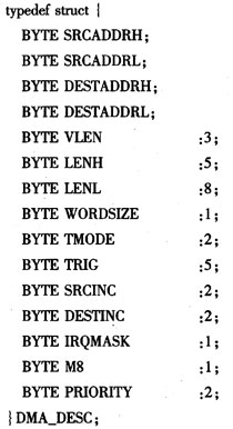 节点软件设计中通过DMA方式实现RF模块与Memory间数据访问,而不用CPU干预。DMA通道描述的数据结构如下: