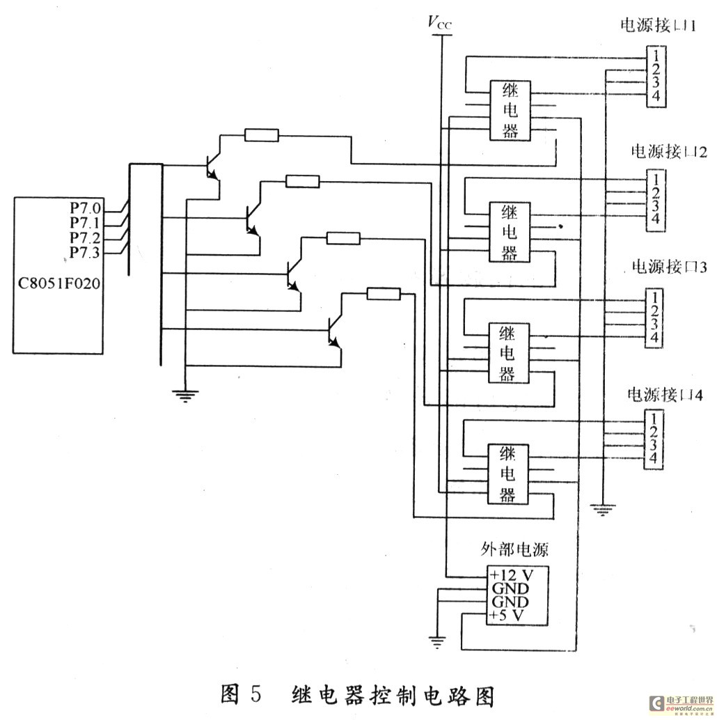 本系统中,每台从机上所搭载各硬盘的数据线均与PC机的主板相连。主控机发出指令后,由安装在从机内的控制单元进行接收,并通过控制固态继电器来完成对目标硬盘电源的驱动,从而实现硬盘的选择功能。在无控制信号时,继电器控制端的两端电势相等,电位差为0。当接收到控制信号后,单片机在经过处理后,相应的I/O口产生高电平,引导开关三极管导通,继电器的控制端随即接地,在继电器控制端的两端就产生了大小为Vcc的电位差,继电器的输出端转变为通态,外部电源便可通过电源接口给相应的硬盘供电。其电路图如图5所示。
