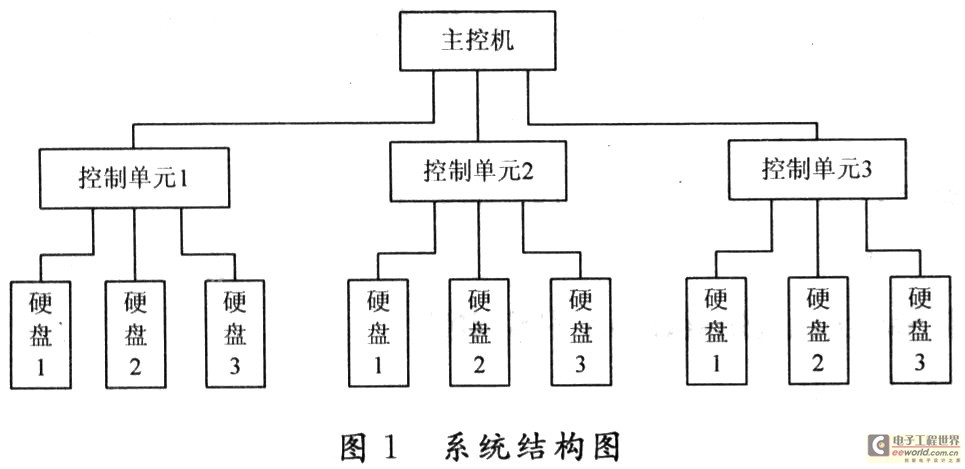 作为某型防空指挥系统的子系统,本远距离控制系统由一台PC机,若干个控制单元,以及连接PC机和控制单元的数据线组成,每个控制单元又分别对应三个受控对象,即三个硬盘。其中控制单元主要由单片机和继电器两部分构成,完成对主控机发出指令的接收、分析、处理,和对硬盘的控制等功能。工作原理如下:本系统采用半双工主从通信方式,有一台主机和多台从机,主从机之间通过RS 485总线进行由主机到从机的单向通信,且各从机之间互不通信。从机在读取信息后,对其进行分析、判断,继而完成相应的控制功能。其结构图如图1所示。