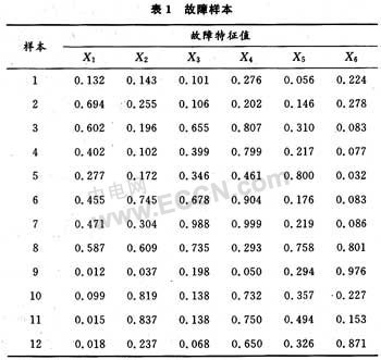 该系统的故障征兆可由以下可测的工艺参数表征:澄清池入口温度、澄清池出口温度、澄清池入口流量、澄清池入口调节门开。度、澄清池出口浊度、澄清池泥渣。将故障征兆进行归一化处理计算,得到6个[0,1]之间的故障征兆特征值,X=(X1,X2,…,X6)作为神经网络的输入。