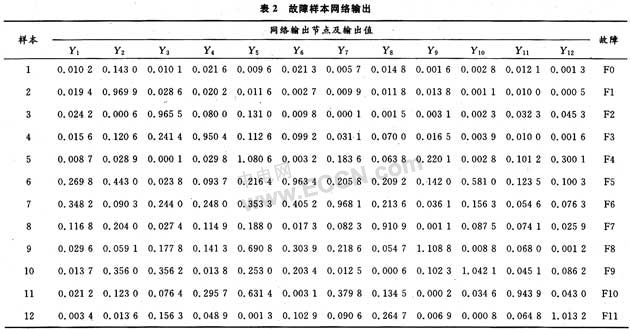 BP网络的训练样本来自电厂相应故障的累计数据。表1列出了故障样本,其中每个样本均有6个特征值,选择足够多的代表正常状态和故障状态的样本,采用BP算法对6-10-12网络进行训练。在系统总误差为0.01,步长为0.5时,网络训练10 000次,或直到满足性能要求时停止训练,否则增加训练次数。