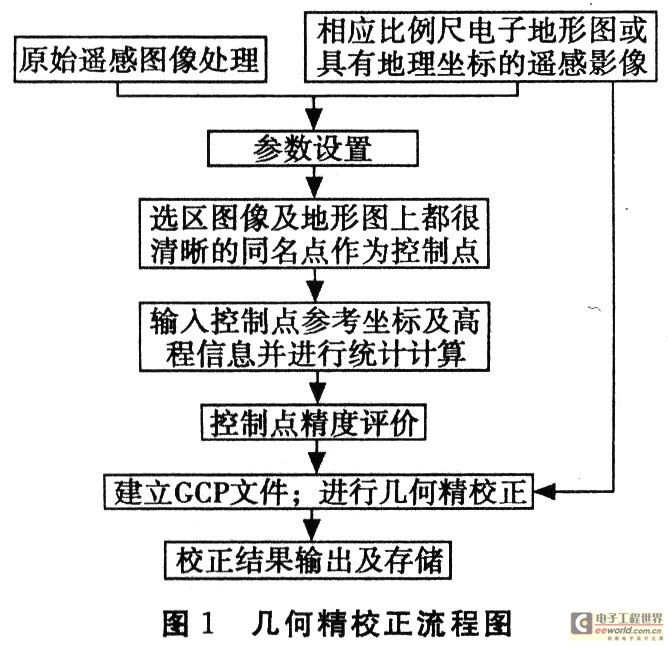 由于人们已习惯使用正射投影的地形图,因此对各类遥感影像的畸变都必须以地形图为基准进行几何校正。几何校正就是将图像数据投影到平面上,使其符合地图投影的过程,几何校正最重要的是控制点的选取和确定控制点的数量。在遥感图像和地形图上分别选择同名控制点,以建立图像与地图之间的投影关系,这些控制点应该选在能明显定位的地方,如河流交叉点等。其次建立整体映射函数,根据图像的几何畸变性质及地面控制点的多少来确定校正数学模型,建立起图像与地图之间的空问变换关系。