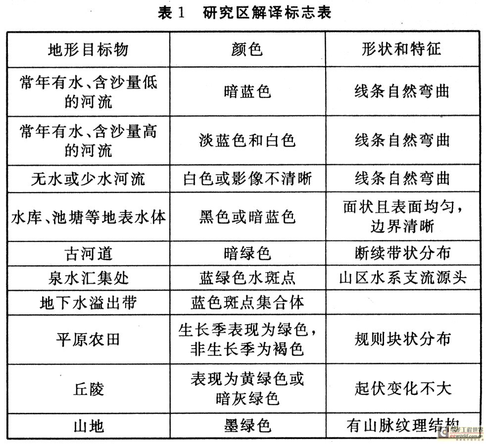 遥感图像的初步解译阶段,水资源较自然地理环境中的其它地形物,具有低反射率和强烈吸收红外波谱的特性,因而在遥感卫星影像上,特征较为明星,详细地表物解译结果如表1所示。
