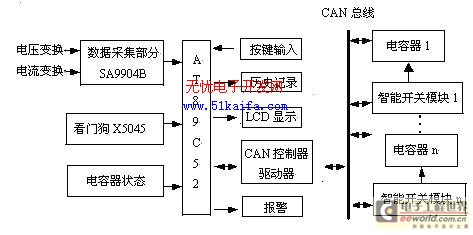 控制器的工作原理是:从控制现场传感器CT、PT送来的电流、电压信号,经过二次变换,转换成0~2V,0~5A信号。这些信号再经过处理,使输入的电压、电流信号满足数据采集测量芯片SA9904B的输入要求。SA9904B把测得的三相电力参数相关值如电压、有功能量、无功能量、频率等存在其内部暂存器里。微处理控制器采用的是AT89C52型单片机,通过SPI接口访问SA9904B内部的24位暂存器,把暂存器的数据根据相应的公式计算就可以得到各相有功功率和无功功率,以及各分相有效电压和频率。根据预设的控制策略就可以决定要动作的开关模块,然后主控制器把要动作的智能投切模块以及要进行的投切动作以帧的形式送到CAN总线上,相应的智能开关模块控制电容器的投切。