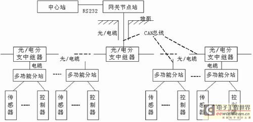 整个煤矿安全监控系统设计由地面中心站、网关节点站、分支中继器、井下监控分站和各种传感器,以及通信介质六部分组成。其中中心站负责接收、存储和显示从井下监控分站传来的各种井下生产环境安全监控数据,并通过各个井下分站发送各种配置命令和对现场设备的控制命令;网关节点站实现现场总线协议和中心站计算机标准接口协议的相互转换;分支中继器在需要的地方完成通信线路的分支、中继和介质信号的转换;传感器负责收集各种现场环境安全监控数据和设备运行状态数据;通信介质负责安全监控系统各设备的连接和信息的传递。整个监控系统分三级结构:中心站—井下分站—传感器。传输介质根据传输距离不同,可分段采用不同线缆,长距离用光纤不加中继器,或用电缆加中继器,短距离则可只用电缆不加中继器。如果连接的节点总数大于110个,则也需加中继器。图1是带有中继器的煤矿安全监控系统组成原理图。