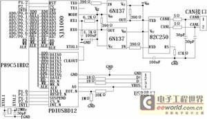 为了保证P89C51RD2、PDIUSBD12和SJA1000三者间时钟同步,外接12MHz晶振的CPU运行于6时钟模式下,P1.0引脚通过编程输出6MHz方波作为PDIUSBD12的输入时钟,再通过PDIUSBD12的设置模式寄存器编程使CLKOUT引脚产生24MHz的输出时钟来提供给SJA1000。PDIUSBD12的INT-N接CPU的端,通过中断方式与CPU通信; SUSPEND引脚接CPU的P1.4端,用以向CPU指示器件是否挂起;D+引脚信号通过软连接接1.5K的内部上拉电阻,向主机表示为高速设备;为确定USB电缆是否与主机连接,采用EOT-N引脚检测USB接口的VBUS电压来实现;由于采用多路地址/数据总线配置,故A0接高平;此外,D+和D-两引脚各接18电阻,起到一定的限流作用,以保护PDIUSBD12免受过流的冲击。
