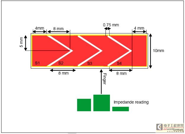 当检测到某传感通道处于开启状态时,就能确定手指在触摸滑动条上的位置。 在上例中,使用了5个传感通到来检测9个位置。 如果S1 和S2 通道同时处于开启状态,就意味着手指的位置位于位置2。