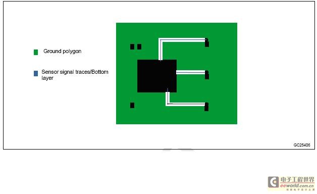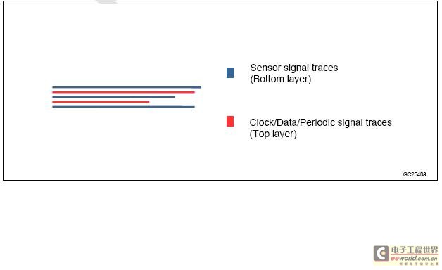 ● 如果时钟、数据或任何周期信号迹线确实需要与传感器的信号迹线平行布设,它们应当被布设在不同的层并且不能重叠,而且应当尽可能地缩短信号迹线平行部分的长度。