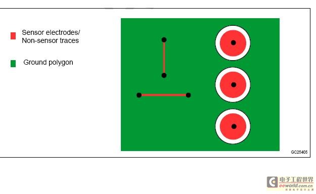 ● 传感器信号迹线的长度并不需要完全等长。 因为使用匹配调谐电容,完全可以使两条通道之间的输入电容达到平衡。 然而,在PCB空间允许的情况下,最好使用长度相等的传感器信号迹线(传感器电极的尺寸也是统一的)。 这样一来,为了把所有传感通道的传感器容抗值调整至控制器感应的动态范围以内,只需设置一个标准参考电容即可,简化了设计难度。