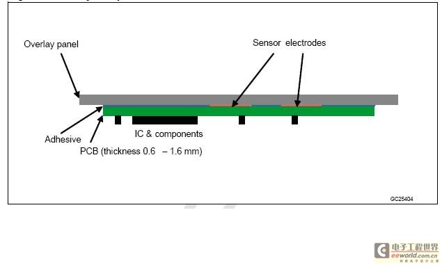 在结构为两层的PCB中,S-TouchTM触摸控制器和其他部件被布设在PCB的底层, 传感器电极被布设在PCB的顶层。