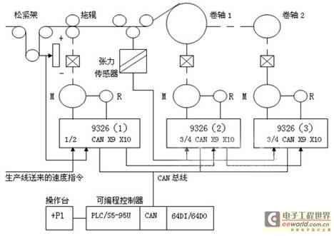 控制部分的核心是一台西门子S5-95U可编程控制器PLC和三台Lenze93系列交流伺服控制器9326。PLC通过CAN总线与三台交流伺服控制器9326交换信息,实现变张力卷绕控制,如图2所示。S5-95U除了配有CAN通讯模块外还有64点数字量输入输出。