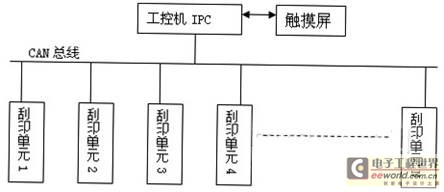 图3示出了一个对BUSH-5V平网印花机刮印部分控制的改造方案。原方案在中央控制器和刮印单元之间使用RS-232串行通讯,速度慢,可靠性差。因而一些关键性的操作仍然沿用传统的方法,直接连线。BUSH-7V改用RS-485串行通讯,可靠性有了提高。在我们的方案中,使用CAN总线实现中央控制IPC与各刮印单元变频器之间的串行通讯,广播起停命令、监控各刮印单元的工作状况;各刮印单元之间也可以相互通讯,复制设定信息,简化刮印单元参数的重复设定。鉴于CAN的可靠性很高,所有的控制和状态信号都通过总线发送,简化了布线,提高了实时性。