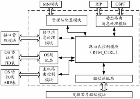 对应上述功能,设计将路由管理模块划分成更小的模块来分别实现。路由管理模块(RTM)由路由表控制模块(RTM_CTRL)、主机路由控制模块、管理与配置模块、动态路由消息处理模块、接口消息处理模块、操作系统适配层以及驱动适配层组成。
