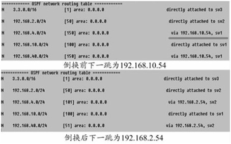 但是这种方法增加了网络维护的复杂度,而且现网业务已经部分开通,修改设备的配置存在一定风险。如果采用VRRP方案,由于只是MSTP网内部的链路状态发生改变,当VRRP发生主备切换时,原有主用接口状态并没有发生变化,接口还是处于UP状态,该路由还会继续宣告,从而导致下行流不通。基于OSPF" title="OSPF">OSPF协议的路由方案由于具有配置简单,风险可控,维护管理方便的特点,因而被本设计采用。