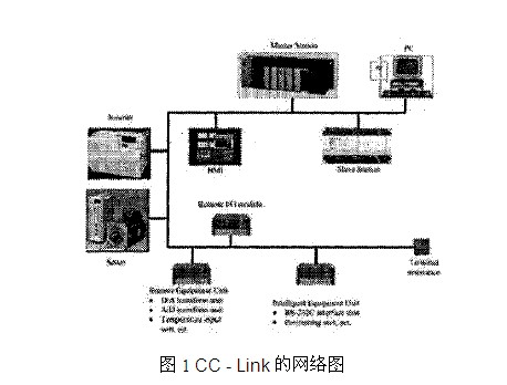 至于高速通信,它使得通信传感器的输入能够满足需要大量数据通信的智能设备和高速响应的要求。作为一个CC-link的功能,RAS功能是:待机主功能,分离从站功能,这些功能使得在通信故障和系统调试时自动恢复过来。至于测试和监控功能,对确认数据连接状态,硬件测试和电路测试都是可用的。CC-Link网络图如图1所示,其监控系统由主站>从站>“个人电脑”>逆变器>伺服电机>远程I / O单元等。