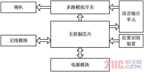 从功能方面,该系统又可分为语音播放单元、多路模拟开关、位置识别开关、无线通信单元和电源及低功耗设计单元六个部分。其中模型人内部系统框图如图1所示。