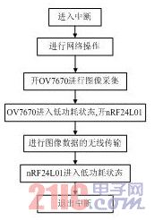 尽可能降低能耗是节点软件设计的最主要原则。在本节点的软件设计中,对于各个模块的时序要进行优化设计CONTROL ENGINEERING China版权所有,不再用的电路模块,要尽快使其关闭或进入低功耗状态。本节点工作在星型结构无线传感器网络中时,按照图3、图4所示流程图进行软件设计。图3为节点软件总体流程图。在节点主程序中主要是完成系统的初始化以及网络初始化的一些工作,而应用程序主要是在中断程序中进行实现。图4为中断程序流程图,该中断程序用来采集和传输图像,并完成一些网络操作工作。在整个程序设计中,对于各个模块的工作时序进行了严格控制,系统大部分时间工作在低功耗模式CONTROL ENGINEERING China版权所有,其他各个模块在不用时也使其尽快进入低功耗工作模式,从而降低了整个系统的能耗。