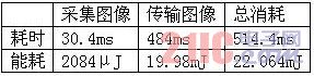 对图像传感器节点的性能分析主要集中在两点:节点的能耗和图像传输的实时性。本文设计的图像传感器节点有五种工作模式:图像获取模式、操作SRAM模式、无线传输模式、MCU正常工作模式、Shutdown模式。表1给出了本节点在各种工作模式下的功耗情况。在正常情况下,节点在采集图像并传输完成后会很快进入Shutdown模式,等待下一次采集图像,以降低能耗。