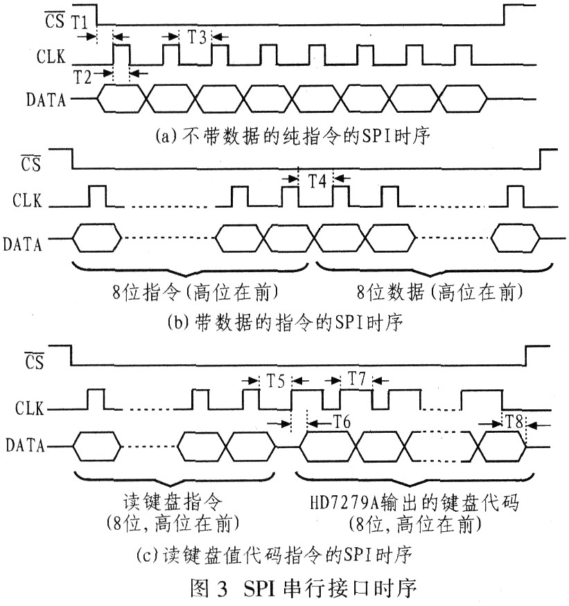 HD7279A与单片机采用SPI串行接口方式连接,共有3种类型16条命令格式,即不带数据的纯指令,带数据的指令和读键盘键值代码指令。