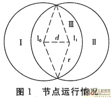 如图l,节点在t0时刻由位置l0开始移动,并在t1时刻到达位置l1,节点离开区域I并到达区域Ⅱ,但始终在区域Ⅲ内。到达节点和离开节点都为节点的位置估计提供信息,节点知道在t0时刻位于以如为圆心且半径为r的圆形区域内的信标节点,在t1时刻并不在l1为圆心且半径为r的圆形区域内。