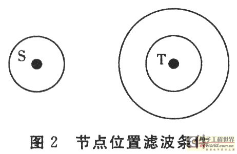 图2描述了节点的位置滤波条件。图中。S表示节点N能侦听到的所有信标节点分组。T表示节点N的邻居节点可以侦听到而节点N本身无法侦听到的全部信标节点。因此,节点位置l的滤波条件可以由式(2)表示。