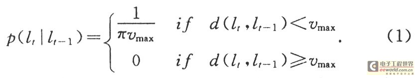 在MCL算法位置预测阶段,节点从前一阶段计算出的一组可能位置Lt-1开始,对每个采样值应用节点移动模型从而获得一组新的采样值Lt。假设节点的移动速度和方向未知,而只知道其速度值小于Vmax那么,如果lit-1是节点的一个可能位置,那么节点所在的当前可能位置则位于以lit-1为圆心、半径为Vmax的圆形区域内。如果用d(l1,l2)表示两点l1和l2之间的欧几里德几何距离.而且节点的移动速度在区间[0,Vmax]上服从均匀分布,那么节点基于先前位置的当前位置估计的概率分布可以通过以下均匀分布的形式给出。