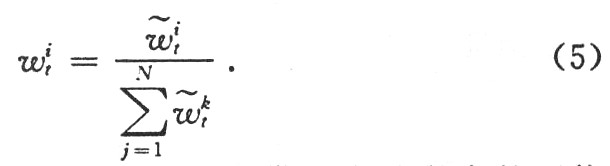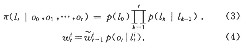 式(3)表示节点的位置预测,节点借助先前所在的可能位置预测其当前的可能位置。式(4)表示节点的位置更新,节点根据获得的观测值对新的采样值不断进行权重值更新与调整。然后。通过式(5)对权重值Wit;进行归一化处理得到Wit用权重值序列(lit,wit)对节点位置的后验概率分布作出估计。通过式(3)和式(4)的反复计算,很容易地确定概率值p(lk|lk-1)和p(l1|Ot)的大小。