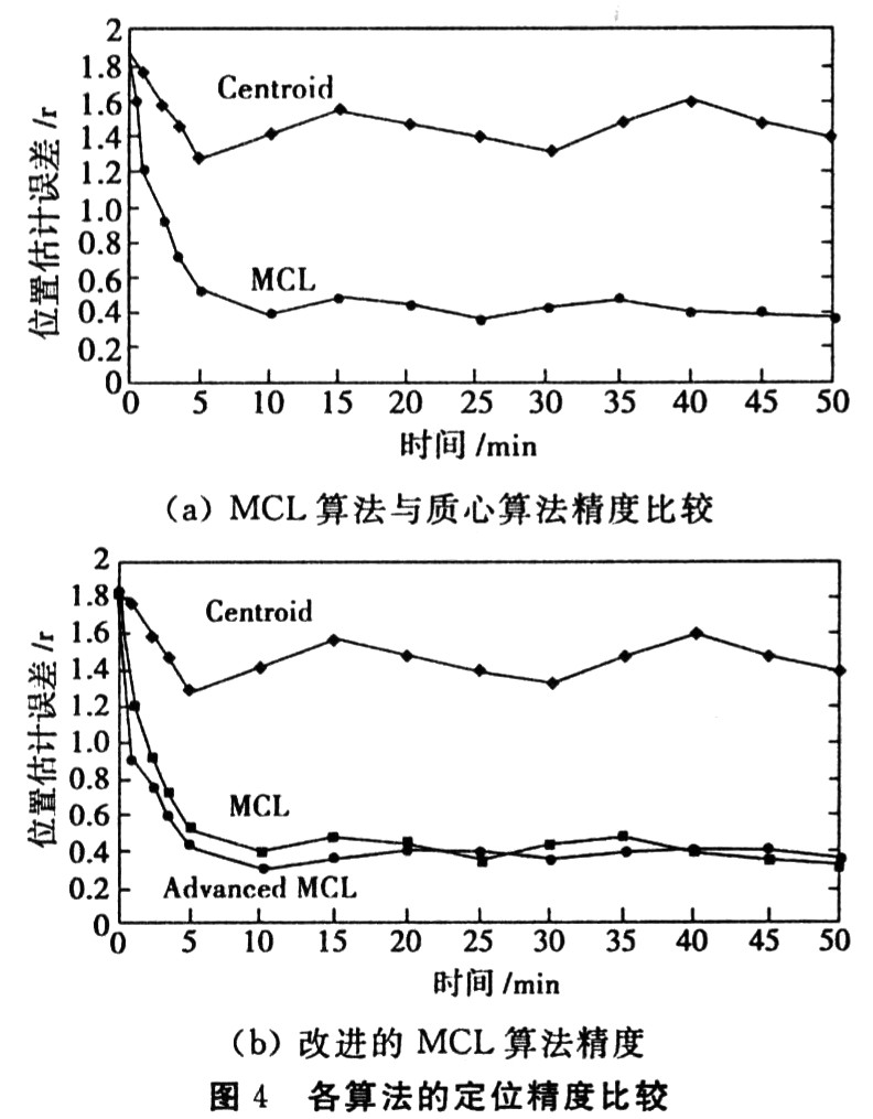 在一定的通讯开销和硬件配置条件下,评价一种节点定位方法优劣的重要标准是位置估计精度的高低。通过仿真对MCL.定位算法、改进后的MCL,定位算法和质心定位(Centroid)算法进行了比较。